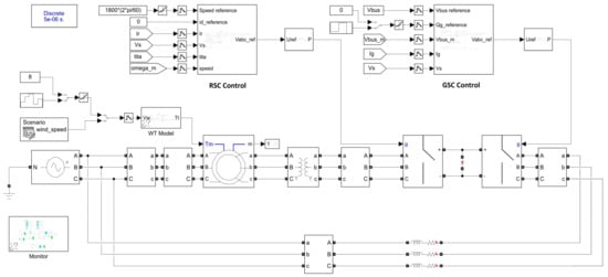 The main power flows out of the stator and is fed to the grid through the generator and transformer. The power handling capacity of the back-to-back converter is about 30% of the rated power. This back-to-back converter works as a bisectional power flow. The rotor power is first converted to DC by rotor side converter (RSC) [], then this DC is again converted to AC utilizing grid side converter (GSC) [] and fed to the grid via the transformer. In wind speed variation, these converters prevent the machine from damage and support the grid line []. The RSC is responsible for the active, reactive power exchange to the grid. GSC controls the DC link voltage and grid point of the common coupling power factor utilizing reactive power exchange [].