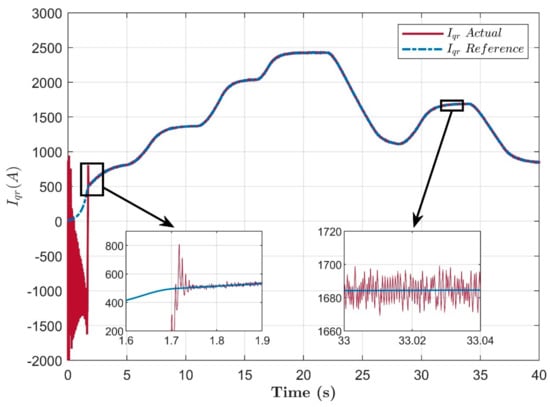 Reference and actual quadrature rotor current tracking performance.