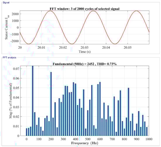 The THD analysis for the stator current from the frequency range of 0 Hz to 1 kHz for three cycles with the fundamental frequency of 50 Hz is shown in Figure 31. This clearly shows that when the generator runs at its rated speed, the THD content in the stator current is only 0.73%.