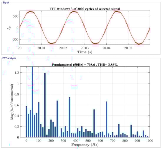 Figure 32 shows the THD analysis for the grid current for three cycles, with a frequency range of 0 Hz to 1 kHz with the fundamental frequency of 50 Hz. As seen from Figure 32, the THD content in grid current is only 3.86%, according to IEEE standards.