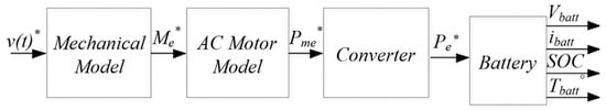 The driving cycle is defined in terms of speed and time. To identify the power profile required for the cell under test the vehicle model proposed in [22] was used and depicted in Figure 2. The model consists of three main blocks namely, the dynamic model of the vehicle, the AC motor model and the converter model [25]. The first block determines the traction effort on the basis of the mechanical force pushing the vehicle and computes the load torque at the motor shaft (Me*) and shaft speed. The AC motor model computes the electrical power Pme*, which the inverter is tasked to provide. The model of the converter estimates the power at the poles of the battery pack. The main technical specifications of the considered Electric Vehicle are summarized in Table 3.
