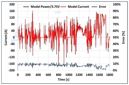 Since the SOC, it was found useful to limit the SOC of the cell under test to 30% maximum, furthermore for the current profile extraction has been used the nominal voltage matching with 50% SOC. Under these conditions, the operating voltage window is relatively close to the nominal value of 3.75 V. As a result, the error between the current profile extracted from the model and the current profile computed as the ratio of power and rated voltage of 3.75 V have a max error of 13.36% and a mean error of 7.78% (Figure 4). The error was deemed acceptable.