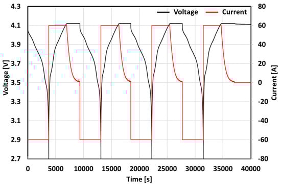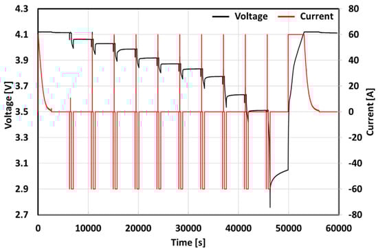 As described in Table 5, the pulse test encompasses a 10 s discharge at 1C (63 A), a 3-min wait phase, a 10 s charge at 1C, a 3-min wait phase. A 1C discharge of 10% of the capacity is then performed; it is assumed to be 10% of SOC. Finally, a 1-h rest is accomplished. The procedure is repeated until the lower cut-off voltage is reached.