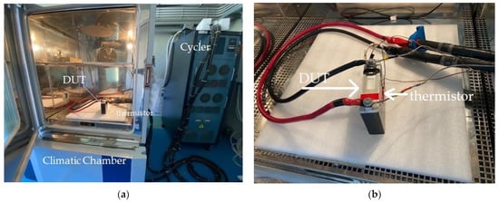 (a) Bitrode cycler on the right and Angelantoni climatic chamber on the left; (b) DUT inside the climatic chamber.