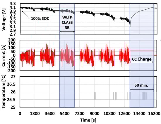The current driving cycle was applied to Cell 1. During each step of the ageing test the cell starts from the fully charged condition (SOC = 100%). Upon reaching the voltage of 3,1 V, identified as the minimum safety voltage, the charging phase is triggered. Under these conditions the full discharge of the Cell 1 is about 6 current driving cycles. However, current driving cycles will age Cell 1 over time, causing a degradation leading to a shorter time to reach the lower cut-off voltage than under BOL conditions. For the recharging phase, it is known that electric vehicles require rather long charging times. However, electric vehicles can be recharged faster by using high-power charging stations (e.g., DC fast stations) [28]. Therefore, a charging time below one hour has been assumed only with a CC charging until the upper cut-off limit without a CV charging phase. In Figure 8 a single-step of ageing test with a WLTP CLASS 3B driving cycle is reported. The value of SOC was computed by considering the capacity discharged from Cell 1 during the tests.