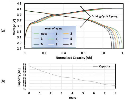 (a) Charge and Discharge time diagram during WLTP CLASS 3B driving cycle at 25 °C from BOL to 8 test years of ageing (b) Capacity drop after battery ageing.