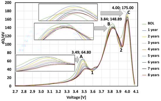 In Figure 11 is shown the evolution of the IC curve obtained by differentiating the 1C discharge curves at different levels of ageing (years); it should be noted that, here a high C-rate was used to acquire the voltage capacity curve, even though IC and DV often require a signal very close to the equilibrium condition of the cell. Despite the voltage curves used in the present work to perform differential analysis were acquired at 1C, the signals provided were still useful for identifying the most relevant signature typical for the chemistry of the cell under investigation. Indeed, as already proven in previous works, a higher C-rate can still be useful for ageing mechanism identification [32,33]. By observing the IC curve three different peaks A, B and C can be identified at 3.47 V, 3.8 V and 4.1 V, respectively, which can be related to the graphite anode signatures [34]. On the other hand, the cathode phase transitions are not visible on the curve. Nevertheless, the overall shape of the curve suggests that the cathode chemistry is a combined LMO/NMC composition as already reported for the same cell [23]. The most important variations as the effect of ageing are observed on peak A, which dropped almost 36% and shifted by 5 mV to higher potential in comparison to the fresh cell. Lower decreases of the intensity close to 10% are also observed for both peaks B and C. Despite the evolution in intensity, the positions of both peaks B and C on IC curves remain almost unchanged. On the basis of previous interpretations of the IC curve to identify the degradation mechanisms [35,36], the evolution of peak A can be mainly related to LLI, while the constant decrease in both peaks B and C can be due to the LAM of the negative electrode. With regards to the peaks position, during discharging, the change in voltage is negative and the peak in the IC graph are shifted to lower potentials because of the overvoltage caused by the polarization resistance [37]. Since the shift of peak A with ageing is in the opposite direction and both peaks B and C remain unchanged, in agreement with the internal resistance evaluated by the pulse test, also IC analysis confirms that no relevant IR loss occurs.