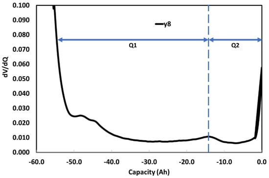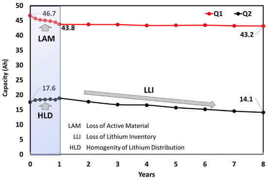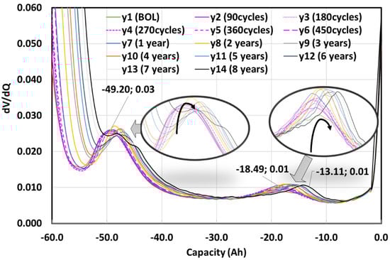 Figure 12 deals with the evolution of the DV curve when differentiating the 1C discharge voltage profiles, similarly to what was done for IC analysis. The DV curve shows two peaks, which match with the valleys 1 and 2 in the IC curve and are representative of the anode signature of the cell. No cathode signatures are instead observable in the DV curve as already reported for similar batteries when a full cell voltage profile is used for the analysis [39]. In order to deeply investigate the degradation mechanisms of the cell, peak 2, which indicates a 50% graphite lithiation, is used as a reference process; it is to be noted that for the cell under investigation, this peak is centred at about 75% of the total capacity, which suggest that the anode is overhang as typically for lithium battery [40]; this peak divides the DV spectra in two regions identified as distance Q1 and Q2 in Figure 13. The evolution of the distance Q1 with ageing can provide information about alteration on lithium storage capability of the graphite anode, then it is representative of anode degradation due to LAM. On another hand, Q2 gives information about cycling lithium between anode and cathode, therefore its change is indicative of a possible LLI side reaction [41]. Figure 14 deals with the progression of both Q1 and Q2 parameters as the effect of equivalent years of ageing under WLTP CLASS 3B driving cycles. Q1 change rapidly in the first year decreasing its value from 46.7 to 43.2 Ah then holding essentially the same value for the following cycles. On the contrary, a larger variation of the Q1 value can be observed, with a slight increase during the first year, and a progress drop proceeding with cycle ageing. The evolution of Q1 suggests that, after an initial loss of storage capability of the anode it is almost unchanged, then a slow degradation occurs with the cycles in the following years; this observed behaviour suggests that during the first driving cycles, the anode undergoes initial conditioning due to the repeated volume changes of the graphite grains during lithiation and delitiation phases. As is well known, these contractions and expansion lead to the formation of particle cracking or to the detachment of the active material from the electrode with consequent isolation of the particles and therefore to loss of active material (LAM) [42]. The lack of further evolution of Q1 after the first few cycles could mean that, following the initial rearrangement of the anode material, there is no longer a relevant LAM of the negative electrode. In contrast, Q2 follows a linear loss of capacity, suggesting that LLI is the dominant degradation mechanism induced by WLTP CLASS 3B driving cycles on the DUT; this ageing mechanism is in agreement with previous literature for the chemistry of the DUT and it is attributed to the continuously slow growth of the SEI layer on the negative graphite electrode [43,44,45]. However, a more detailed analysis of the trend of Q2 during the first year shows a slight increase in capacity compared to the fresh cell, which could be related to a larger amount of cycling lithium inside the cell. To better understand this phenomenon, it is possible to analyze the change in the shape and height of the peaks in the DV curve. Regarding peak 2, corresponding to the phase transformation of the high SOC anode, it rises in intensity also becoming sharper during the first cycles corresponding to about the first year of ageing, then shifts to the right keeping the shape and magnitude unchanged. The magnitude of the peaks is usually related to the degree of homogeneity of lithium distribution (HLD) inside the cell, and in particular, the increase in intensity due to the charge and discharge cycles could be explained by an improvement in the HLD compared to the fresh cell not yet adequately conditioned [46,47]. A result similar to the one just discussed was obtained by Sieg et al. [48] investigating the ageing phenomena induced by an EV driving profile on a cell based on an NMC cathode; they observed that the peak shown in the differential voltage curve at high SOCs corresponding to an anode transformation shows an increase during the first few cycles and then decreasing over time due to the effect of cycles on the cell. Such an evolution of peak intensity has been related to an initial enhancement of the HLD of the cell and then to a change in graphite material or microstructure. Further confirmation of the improvement in HLD comes from the analysis of peak 1 in Figure 12. As ageing progresses, a shoulder appears on the right side of peak 1. The reason for this phenomenon has been related to the enhancement of HLD as an effect of fresh cell cycling [49]. Although this phenomenon typically occurs immediately after the first full charge cycles [50], we observed it only after having carried out several driving cycles. Since this homogenization of lithium occurs when the slope in the voltage curves of one electrode is remarkably high compared to the counterpart electrode, it is plausible that since the driving cycle operates mainly within intermediates SOC, rarely reaching the end of charge or discharge delaying the phenomenon over time.