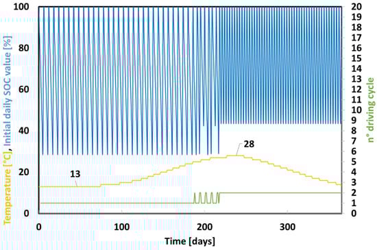An average daily temperature for the 8 years of the test was considered to make this calculation, in particular, referring to a real situation in Messina, Italy [56]. Similarly, considering the effect of range anxiety involving a driver of an electric vehicle, it was assumed that the driver would never want to find himself with a residual range of less than 30% [57,58]. To better define range anxiety, it is the fear of not being able to find an electric recharging station before the battery runs out. Therefore, the SOC value variation due to the driving cycle is between 30% and 100% and depends on the previous SOC value of the cell reached after the last driving cycle is done and computed from the vehicle model described above. Instead, the calendar ageing was computed for each partial day (excluding the time required to perform the driving cycle and the recharging phase if required), and it is affected by reached SOC and temperature. A typical year variation of Temperature, initial daily SOC and number of driving cycles are depicted in Figure 19.