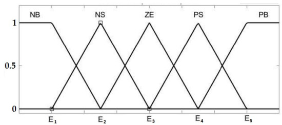 Here is power error, is generator power reference, is discrete time step, is generator power, and is the change in power error. A third input variable is also used, namely, the deviation of the generator speed from its nominal value, . Any modification on the pitch angle will affect the generator speed. The generator speed, on the other hand, determines the turbine power. The inclusion of our third variable provides the controller with the freedom of tuning its action with the instantaneous generator speed. When the power error requires an increase in generator speed, and when this speed is already excessive, a moderate action on pitch angle variation can be taken. If instantaneous generator speed is not considered in the control output decision, however, a large pitch angle would be commanded. Triangle membership functions with overlaps are utilized to build the fuzzy sets of inputs, as shown in Figure 5, Figure 6 and Figure 7. The membership functions of power error and change in power error can be seen in Figure 5 and Figure 6. The membership functions of generator speed deviation are presented in Figure 7. Negative Big (NB), Positive Big (PB), Negative Medium Big (NMB), Positive Medium Big (PMB), Negative Medium (NM), Positive Medium (PM), Negative Small (NS), Positive Small (PS), Zero (ZE) are the linguistic variables. Membership function variables are unknown and calculated with the GA.