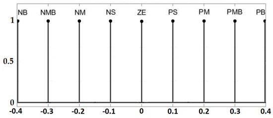 The singleton membership functions of the output are presented in Figure 8. This figure shows negative big (NB), negative medium big (NMB), negative medium (NM), negative small (NS), zero (ZE), positive small (PS), positive medium (PM), positive medium big (PMB) and positive big (PB) rule strengths.