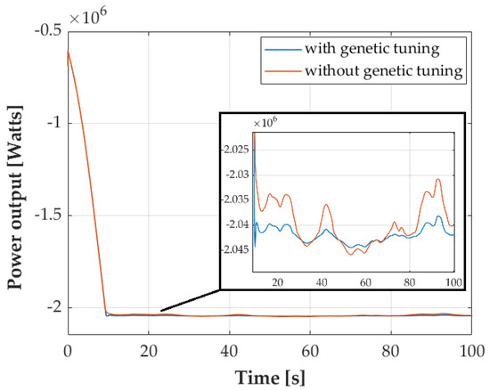 Power output with (blue line) and without (red line) using genetic algorithm.