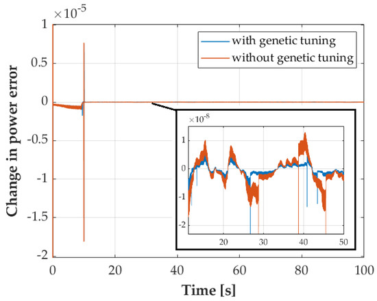 In Figure 10, the maximum power is achieved after the transient phase is completed, and the change in power error is decreased approximately 50 percent with the genetic algorithm. As presented in Figure 11, better performed overshoot in change of error in power is achieved with genetic algorithm. In study [4] which employs fuzzy logic control without genetic algorithm optimization, there are significant errors in power and power error rate of change.