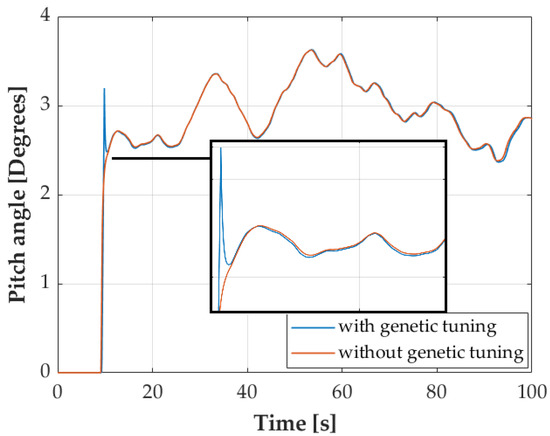 Pitch angle with (blue line) and without (red line) using genetic algorithm.