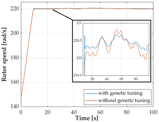 Rotor speed with (blue line) and without (red line) using genetic algorithm.