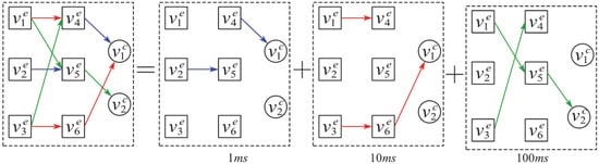 The transfer of the device’s state has a delay caused by the period of sampling, transmission, and processing of messages and the action of the equipment. In TVPHAG, it is manifested as the delay of the failure cascading. Therefore, TVPHAG is a dynamic directed graph with asynchrony. Figure 1 shows a simple TVPHAG, which can be divided into multiple subgraphs according to the period of delay. In this paper, the transmission mechanism of failure probability is represented by matrices and . Through the above analyses, matrices and are time-varying.