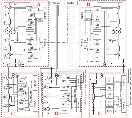 The D2-1 smart substations in IEC 61,850 presently have been built more, including transformer bays, bus bays, and feeder bays. The primary equipment includes primary power equipment such as buses, transformers, circuit breakers (CB), disconnect switches (DS), and electronic voltage current transformers (VCTs). The secondary equipment includes the merging unit (MU), the intelligent electronic device (IED), the protection device (PD) and the measurement and control device (MD), switches, Network Control Center Server (NCCS), and other equipment [45]. The secondary system can be divided into three levels, viz., station level, bay level, and process level. This paper takes the D2-1 110 kV smart substation as an example. It has 2 SSZ10—40,000/110 main transformers with a total capacity of 2 × 40 MVA, with 110 kV sectionalized configuration, 2 incoming and outgoing lines, etc. Its topology is shown in Figure 3, where A and B are transformer bays, C is a bus bay, D and E are feeder bays, and the same type of bays has the same structures and configurations.