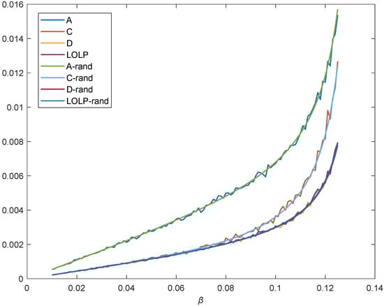 The probability of failure increases with the increase in . The simulation is shown in Figure 6. Two cases are simulated in this paper. One case is that is a constant value, and the other is that is evenly distributed around the constant value. The failure probability of the system increases exponentially and rapidly when . Therefore, the situation that should be avoided. In practical engineering, is related to the degree of connection relationships between equipment. In this study, is selected for the particularity.
