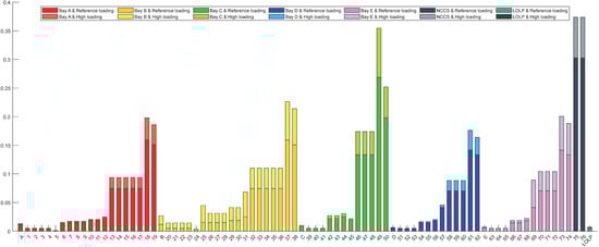 Comparing the two situations where the loading is at a reference and over 80% of it, the result of primary equipment in bay E and bay D is shown in Figure 7. The darker bar represents the situation of reference. In contrast, the lighter bar represents the situation where the loading exceeds reference.