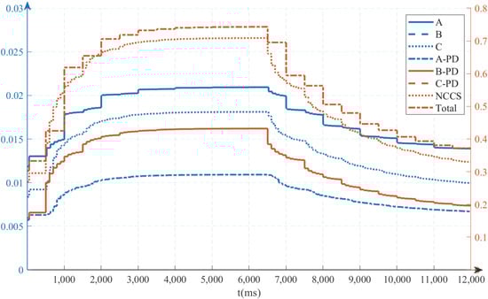 The vertex 75 of TVPHAG is attacked from t = 50 ms to t = 6000 ms by simulation. The results of bay A, bay B, bay C, PD, MD, and NCCS are shown in Figure 8. The failure probability increases rapidly within 2s after the attacks’ arrival. The response of each device has a delay after the attack is applied or removed because the transition between the normal state and the abnormal state requires time to transfer and process.