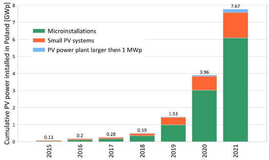 During the last years, 2016–2021, the power of the photovoltaic systems installed in Poland was increasing rapidly. Cumulative installed PV power in 2016 was 0.199 GWp, while in 2021, cumulative power reached 7.67 GWp (Figure 1) [1]. Almost all installed photovoltaic systems are on-grid installations—photovoltaics integrated with an electrical grid [2]. The main increase is observed in installations with a power limitation of 50 kWp, referred to as microinstallations [3] (Figure 1). When an investor is within the microinstallation power limitations, he becomes a Prosumer—producer and consumer of the electrical energy at the same time. When connecting PV microinstallations to the electrical grid, a Prosumer is obliged by the Electrical Energy Distributor to provide only basic information about the PV system, such as the power of the system, producer and model of the modules, and the inverter. In addition, an electrical scheme of the PV system integrated with the internal electrical grid is required. When the power of the PV system exceeds 50 kWp, the investor becomes an Energy Producer, and in this case, in order to connect the photovoltaic installation to the electrical grid, a building permit is required as well as establishing connection-specific conditions for energy producers. The formal path to connect a microinstallation to the electrical grid is simplified compared to PV systems larger than 50 kWp. Great dynamics in the number of microinstallations in Poland installed in the past few years were due to national supporting programs [4], which helped to reduce the costs of PV installations. Rapidly increasing electricity prices also encouraged private and commercial investors to install photovoltaics. Recent changes in the Polish Renewable Energy Law changed the way the Energy Distributor is obliged to trade the electrical energy produced by PV plants. Before the 1 April 2022, the energy produced by Prosumers was consumed within the building, and the surplus was injected into the electrical grid. During the time when there was no sun radiation or the sun radiation was low, Prosumers could reuse the solar energy from the electrical grid with an efficiency of 80% for a system power of less than 10 kWp. For higher powers between 10 kWp and 50 kWp, the efficiency is 70% of the injected energy [4]. The new legislation changed the way Prosumers [3] are obliged to settle the produced energy with an energy company. Net metering [5] was changed to net billing, which is based on selling surplus electrical energy to the provider at the average monthly wholesale market price [6].