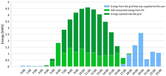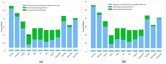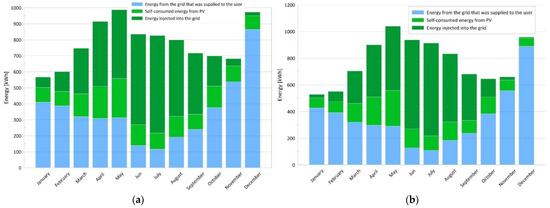 On the basis of the hourly simulations (an example of hourly simulation results is shown in Figure 2), the comparison between considered cases was performed for the household (Figure 3a,b) and the company (Figure 4a,b) in the subsequent months of the year. While analyzing the cases of the two considered investors, one can clearly see that energy self-consumption is much higher for the company than for the household. In the company, only a small amount of produced energy was injected into the grid in April (Figure 4a,b), while for the household, the energy sold for the energy supplier outweighs energy that was self-consumed every month. The highest energy self-consumption value is observed during the winter months (Figure 3a,b), but this period of the year is also characterized by low energy production and high energy needs.