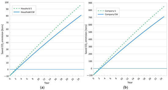 While analyzing the avoided CO2 emission for the given systems, it is rather clear that its value is strictly correlated to the amount of energy produced by the PV systems. The higher the energy produced, the better the CO2 emission reduction. What is also worth analyzing is the time when the PV system becomes emission-free due to balancing the electrical energy needed to manufacture and install all the components included in the entire installation. According to the graphs presented in Figure 5a,b, the PV system facing South for the household as well as for the company will reach the considered balance after two years of operation. For the East–West configuration, this time does not change significantly, and it is 2.5 years, which is a good result, especially since the PV system will work for at least 25 years.