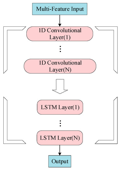 CNN has features, such as shared weights and local connectivity [29], which makes it an efficient processing tool for data feature extraction. CNN can be classified into 1D, 2D, and 3D, and each of the three types of CNN is applicable to different categories. The data sets that make up wind power prediction are essentially time series composed of multiple feature variables, and 1D CNN is mainly used for feature extraction of time series data. In this paper, the time series of temperature and humidity related to wind power are combined with the sub-series of wind speed and wind power decomposed by VMD to form the multi-feature input of the 1D-CNN, which aims to further explore the implied relationship between the feature variables and to improve the training efficiency of the model. Considering the small number of features in the data of this paper, no pooling layer is set in this CNN. The computation process of the 1D CNN is: