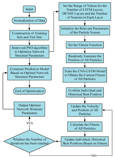 To take further advantage of the total search capability of the particle swarm, this paper introduces the elimination mechanism in the genetic algorithm into the standard PSO algorithm [32]. After the adaptive adjustment of the inertia weights, particles are arranged in descending order according to the fitness value of each particle in this round, and the particles ranked in the bottom 50% of the fitness value are eliminated, while the particles ranked in the top 50% are used as the boundary. The new 50% of the particles are randomly generated within the boundary and combined with the top 50% of the retained particles to form a new population to start the next round of iterations, thus improving the total optimization capability of the algorithm. When the IPSO algorithm is used to optimize the network structure parameters, the positions of the particles are used to represent the number of LSTM layers, the number of DENSE layers, and the number of neurons in each layer of the prediction model. The flowchart of the IPSO algorithm for optimizing the network structure parameters is shown in Figure 3.