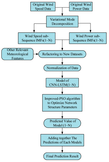 In this paper, VMD-CNN-IPSO-LSTM prediction model is used for short-term wind power prediction, which is mainly divided into six steps, and the prediction process is shown in Figure 4.