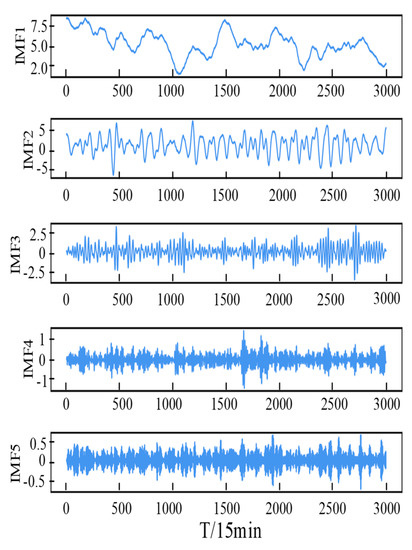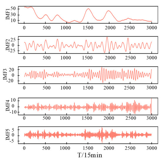 VMD is an adaptive and completely non-recursive mode decomposition method, which essentially smooths the sequence signal [23]. VMD uses iterative search for the optimal solution of the variational model to select the center frequency and bandwidth of each component, so the decomposed modes can achieve the reproduction of the original sequence, and at the same time each mode demodulation to the baseband can be smooth. In this paper, VMD is chosen as the decomposition method because it can effectively reduce the non-smoothness of time series by overcoming the problem of mode component mixing in EMD. The specific decomposition process and the algorithmic steps are described in References [24,25,26,27,28]. VMD is used as a pre-processing tool for time series, and the decomposed mode quantities with different characteristics can be applied as input to subsequent analysis methods for further in-depth analysis.