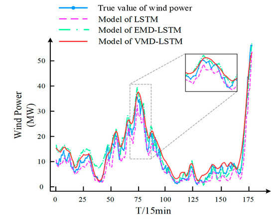 To verify the effectiveness of this model, the VMD-LSTM model and VMD-CNN-LSTM model are introduced to compare the performance of the two models. The network structures of both models are two LSTM layers and two DENSE layers; the number of neurons in the two LSTM layers are 32 and 16, and the number of neurons in the two DENSE layers are 100 and 50, respectively.