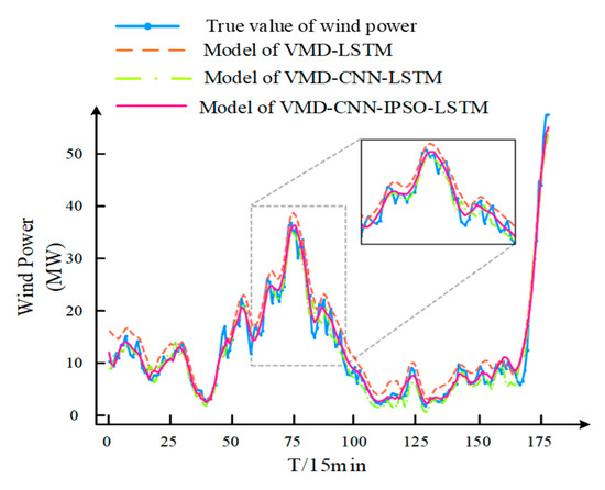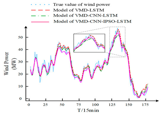 Table 5 shows the values of the prediction performance analysis of each model under the evaluation metrics. Firstly, the accuracy of the model has been improved after VMD processing. After VMD processing, using CNN to further capture the data features will lead to better prediction performance of the model. However, manually setting model structure parameters are not the optimal structure parameters, so IPSO is used to search for the optimal structure parameters of the prediction model corresponding to each VMD-CNN processed dataset. After substituting the optimal parameters in Table 4 back to each prediction model for prediction, it is proven that all the metrics of the VMD-CNN-IPSO-LSTM model are optimal. Compared with the VMD-CNN-LSTM model, the MAE is reduced by 25.7%, the RMSE is reduced by 20.87%, and the MAPE also showed a substantial decrease compared to the above comparative models, while adj-R2 = 0.97349 also indicates that the proposed model is helpful for short-term wind power prediction.
