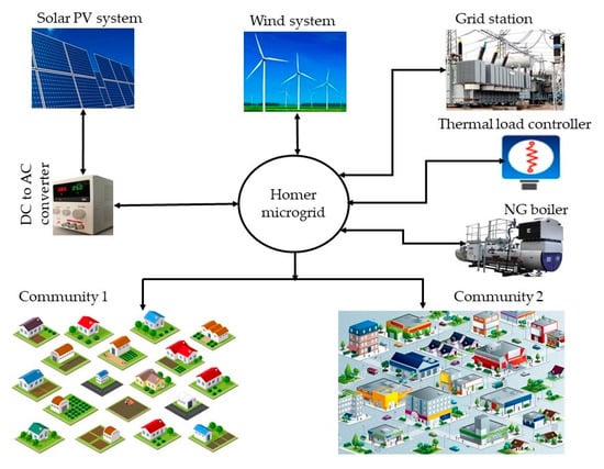 This section presents the system architecture and the connected components. With the purpose of optimally combining all the integrated sources and components, HOMER load following dispatch strategies were used. Figure 2 presents the model diagram of the developed energy system model, where all energy generation and consumption components are connected with the HOMER microgrid. Furthermore, the microgrid optimizes the power generation from the solar and wind systems and supplies required energy to the interconnected load centers. The figure shows that the microgrid is also connected with the local grid station for energy sharing. The two communities’ load centers, Community 1 and Community 2, are connected with the system microgrid which supplies the electricity. Moreover, to meet the thermal energy demand of load centers, a natural gas-based boiler and thermal load controller are used. The maximum installed capacity of the solar PV system is 2500 kW, while the wind system installed capacity is 2640 kW.