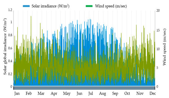 Figure 3 shows the annual solar and wind resources at the selected location, through the solar global irradiance (W/m2) and the wind speed (m/s).