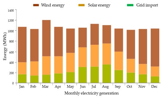 Figure 8 indicates the monthly net energy generated by the solar PV and wind systems, and the energy imported from the local grid station. The given data describes that the energy produced by the renewable energy sources satisfies the 79% of the total electricity demand of both communities, while the remaining 21% of the electricity demand is given by the grid station.