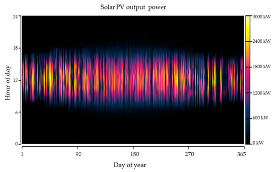 Data presented in Table 4 illustrate the energetic scenarios of the solar PV system, highlighting the significant amount of energy produced by the solar PV system at the lowest levelized cost of energy. Results also indicate that the capacity factor and the PV penetration rate are significantly high, meaning that the system supplies a large amount of energy to the load centers. Moreover, Figure 9 presents the hourly solar power generation during the first year of operation.