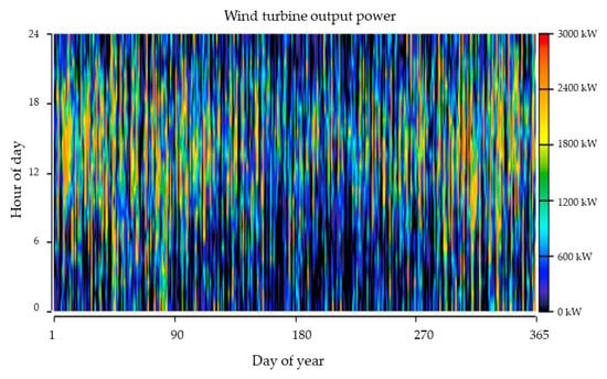 The results in Table 5 and Figure 10 show the operation and energetic analysis of the wind system. The power produced by the wind turbine is quite high and the penetration and capacity factor is also elevated. Figure 10 shows the hourly power generation by the wind system during the first year of operation.