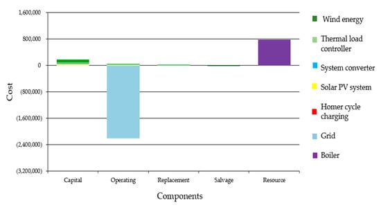 As far as the economic analysis, Figure 12 and Figure 13 describe the economic assessment which includes the capital cost, the operation and maintenance cost, the fuel cost, and the salvage values of the system are presented. Figure 12 illustrates the cash flow over the lifetime of the projects, where the results indicate the operational and maintenance cost, the replacement, and salvage values. Figure 13 shows the initial cost, the cost of used resources, and the annual operational costs.