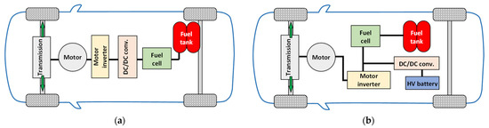 Drive system diagrams employing fuel cell technology: (a) FCEV; (b) FCHEV (based on [4]).
