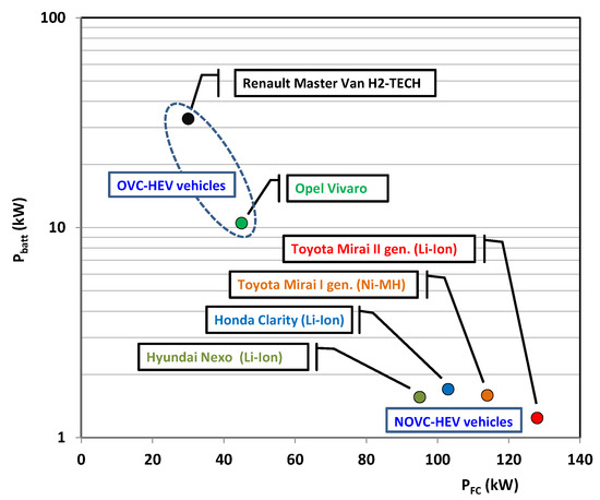 Contemporary FCHEV vehicles offer relatively low battery energy capacity (NOVC-HEV): Toyota Mirai I gen.—1.59 kWh (Ni-MH); [10] Toyota Mirai II gen.—1.24 kWh (Li-Ion) [10], Hyundai Nexo—1.56 kWh (Li-Ion) [11]; Honda Clarity—1.7 kWh (Li-Ion) [12]. These small capacities are due to the fact that the fuel cell serves as the primary propulsion system of the vehicle instead of a battery. The analysis of the battery capacity and the power of the fuel cell was presented in Figure 3.