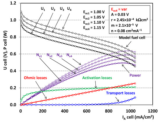 The effect of the voltage change with an open circuit and the associated fuel cell losses were shown in Figure 5. It should be noted that the change in EOC had an impact on the current–voltage characteristic values as well as on the cell power. However, it does not affect the value of the losses. The lack of impact that the EOC has on the cell losses results directly from Equation (1), which means that this value is not a component of the partial elements of the fuel cell losses.