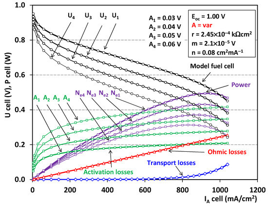 Impact of the changing A parameter of a fuel cell on the I–U characteristics and fuel cell losses.