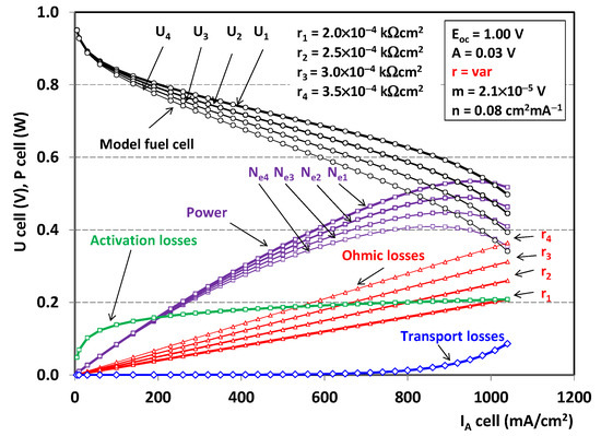 According to Equation (4), increasing the cell resistance r leads to an increase in resistive losses, which results in reduced cell voltage, especially in the linear range (Figure 7). The voltage drop results in a reduction of its power.