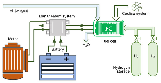 Typical solutions appearing in the literature concern two vehicle propulsion solutions (shown as diagrams in Figure 2): FCEV (fuel cell electric vehicle) [3] and FCHEV (fuel cell hybrid electric vehicle) [3,4,5]. The first one only uses fuel cells for all vehicle propulsion. Although this solution is much simpler in technical terms, it is nevertheless more difficult to implement. The main downside of this system stems from the fact that the fuel cell is an electro-chemical device, and the maximum rate at which chemical reactions take place usually takes a certain time to be reached [6]. Therefore, it is difficult to obtain the maximum power of such a system immediately after its activation. The second solution is a typical hybrid drive system. The fuel cell is usually the primary source of energy for the vehicle.