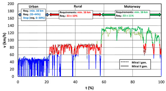 Road tests were carried out on a test route selected by taking into account the urban, rural, and motorway conditions in the city of Warsaw and in the vicinity. The research route fulfilled the conditions set by the RDE (real driving emissions) research test requirements [27,28]. The tests were not used to analyze exhaust emissions and therefore should be referred to as RDC (real driving conditions) tests. The main test requirements and the speed profile of both drives were shown in Figure 11. Analysis of the data in Figure 11 showed much similarity between both the driving tests. Road tests reflect the real traffic conditions to a much greater extent. However, due to the lower repeatability of such tests, the scope of requirements includes a greater possibility of variation in parameters than is normally allowed during tests performed on a chassis dynamometer. The data in Figure 11 indicated the possibility of changing the ranges of the three test phases by up to 10%. In addition, the urban phase includes a very large range of requirements in terms of stopping the vehicle. This indicates the possibility of traffic in conditions of high traffic congestion.