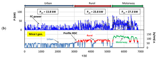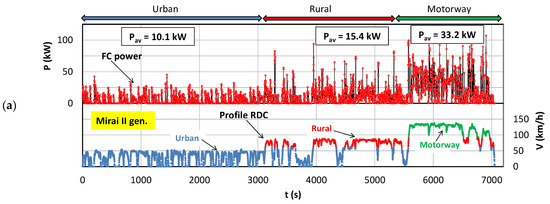 The average fuel cell power values in the first-generation Toyota Mirai were 26% greater than the average values of the second-generation Mirai. Similarly, greater powers occurred in the rural phase of the driving test (by 35%). The motorway phase was characterized by the greater average power of the second-generation Mirai vehicle. The greater cell power was partly responsible for the observed operating conditions, but also the batteries, also with a higher power in the second generation system.