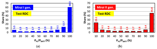 Analysis of the share of the cell’s power in relation to the battery’s power was presented in Figure 14. The data analysis showed that, regardless of the fuel cell system generation, the share of their power in the entire test was the greatest at much greater power than the battery (PFC/PBATT > 90%). The second generation drive system also used a fairly large share of driving at the lowest system power, which means that the initial driving conditions could be achieved with battery drive alone. The transient conditions in which small shares of the cell’s power and high battery power were used turned out to be small. This was shown in Figure 14 in the 20–80% PFC/PBATT power ratio. Summarized, the operating conditions of cells and batteries in both drive generations were within 66–69% of the total share of operating time. PFC/PBATT shares close to 100% do not mean the maximum power of the fuel cell. They indicate the cell’s power is in the range of 90–100% greater than the battery power. This representation of the FC/BATT power ratio indicated that the system usually operates with the fuel cell providing significantly more power than that of the battery. Such a situation and vice versa were implemented in the second generation system. Cases could also be observed where the conditions were NBATT >> NFC. These are conditions labeled as NFC/NBATT < 10% (Figure 14b).