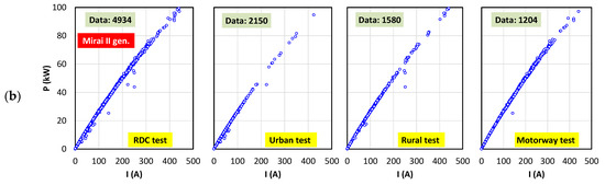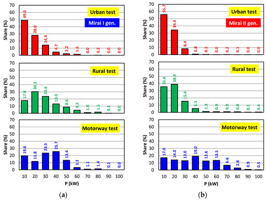 Fuel cells power usage conditions in particular phases of drive tests: (a) Mirai I gen.; (b) Mirai II gen.