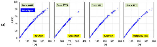 Figure 16 shows that the amount of data for both vehicle drive generations was similar (more than 4500 data points). As can be seen from the characteristics relating to individual phases, the share of higher values of the fuel cell stack power increased with the increase in the driving speed. The current values were about 20% greater for the second-generation vehicle than for the first-generation one. It is important that in both generations of cells there was no inflection of the characteristic (function local maximum), which would indicate the maximum power.